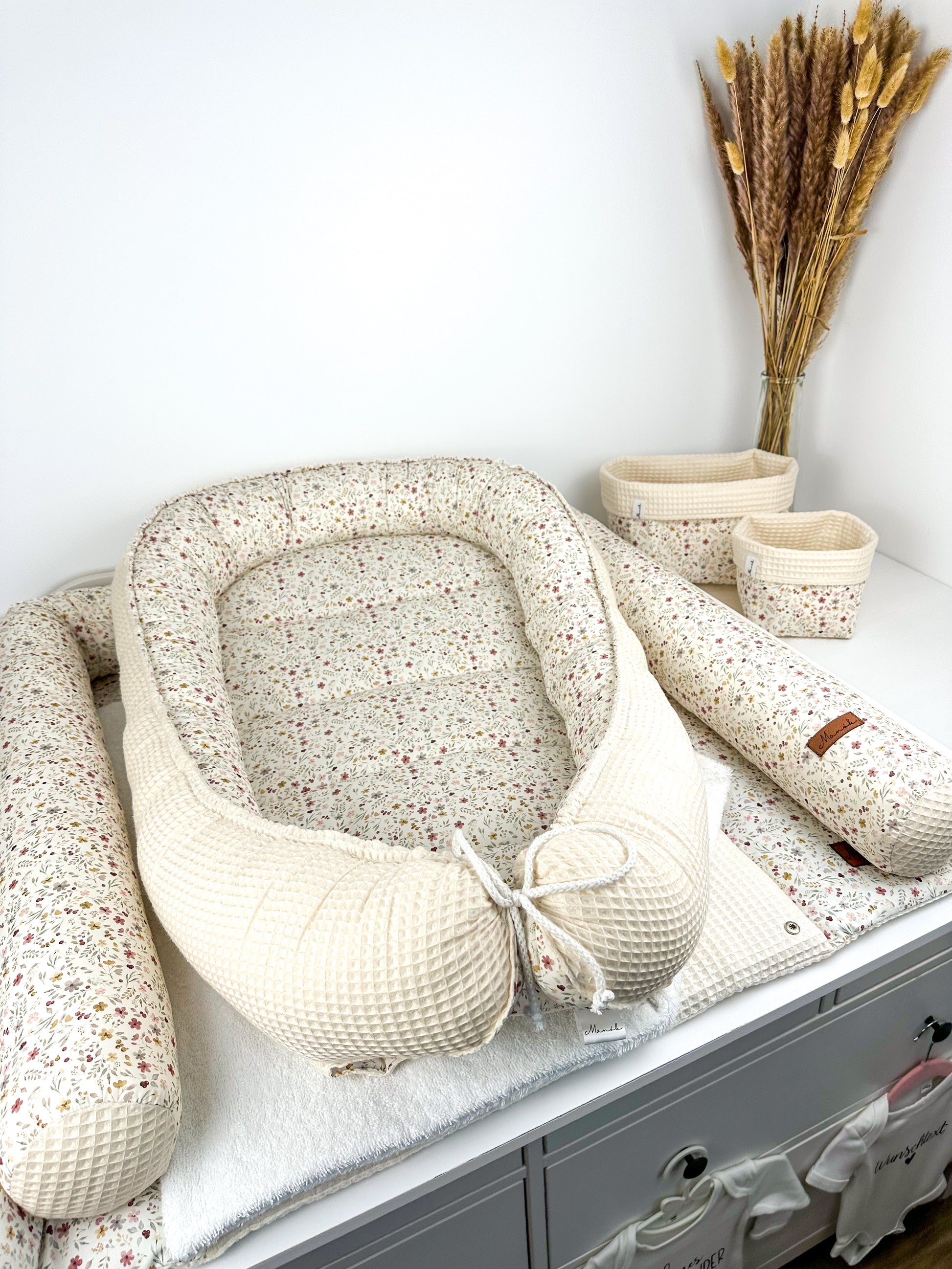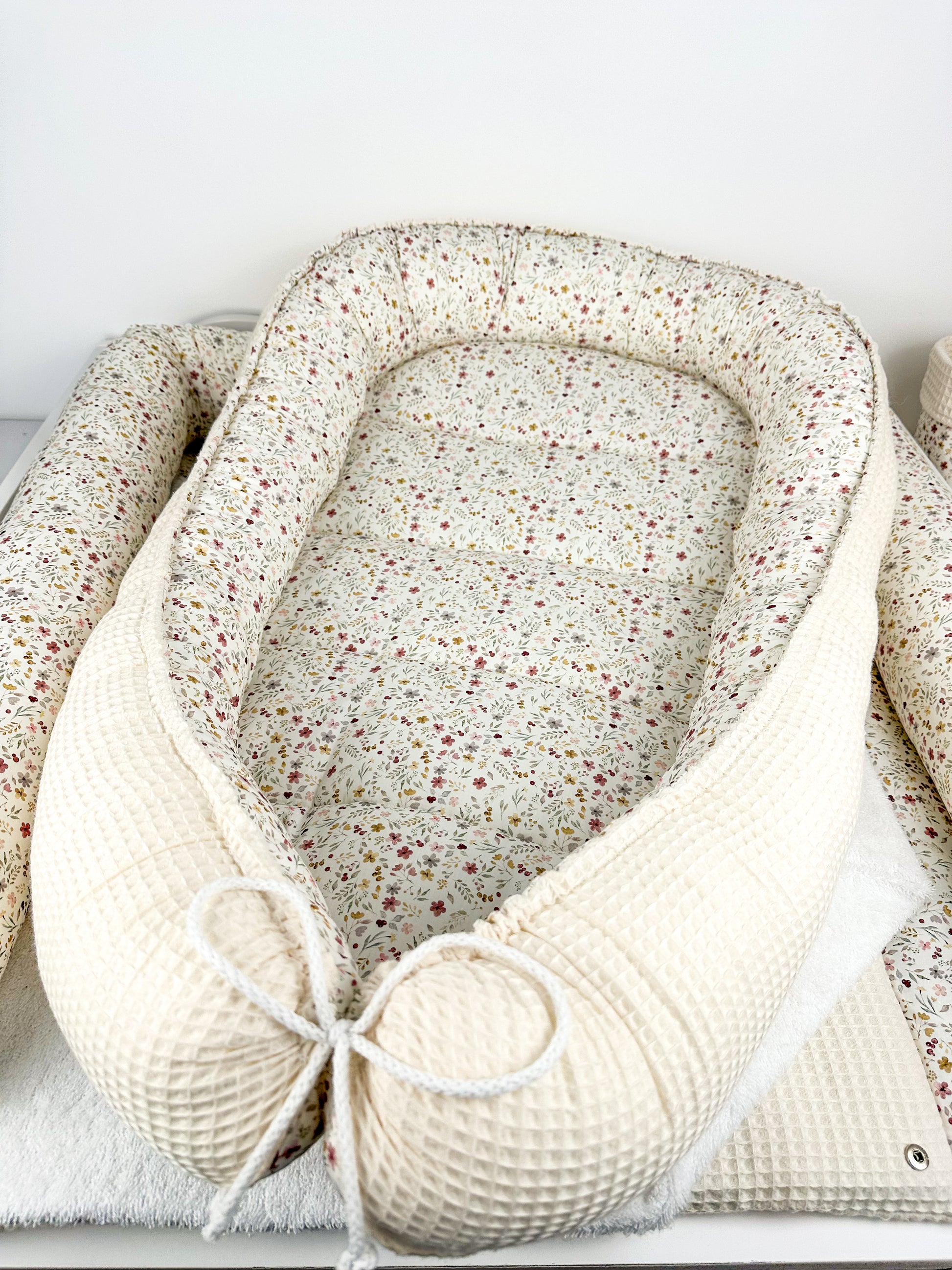 Das Nestchen ist beidseitig verwendbar und sorgt so für Abwechslung. Mit Hilfe des Kordels kann die Größe des Nestchens an die Größe des Babys angepasst werden. Außerdem ist das Nestchen mit einem 4 cm dicken Volumenvlies verstärkt, damit das Baby bequem liegen kann.