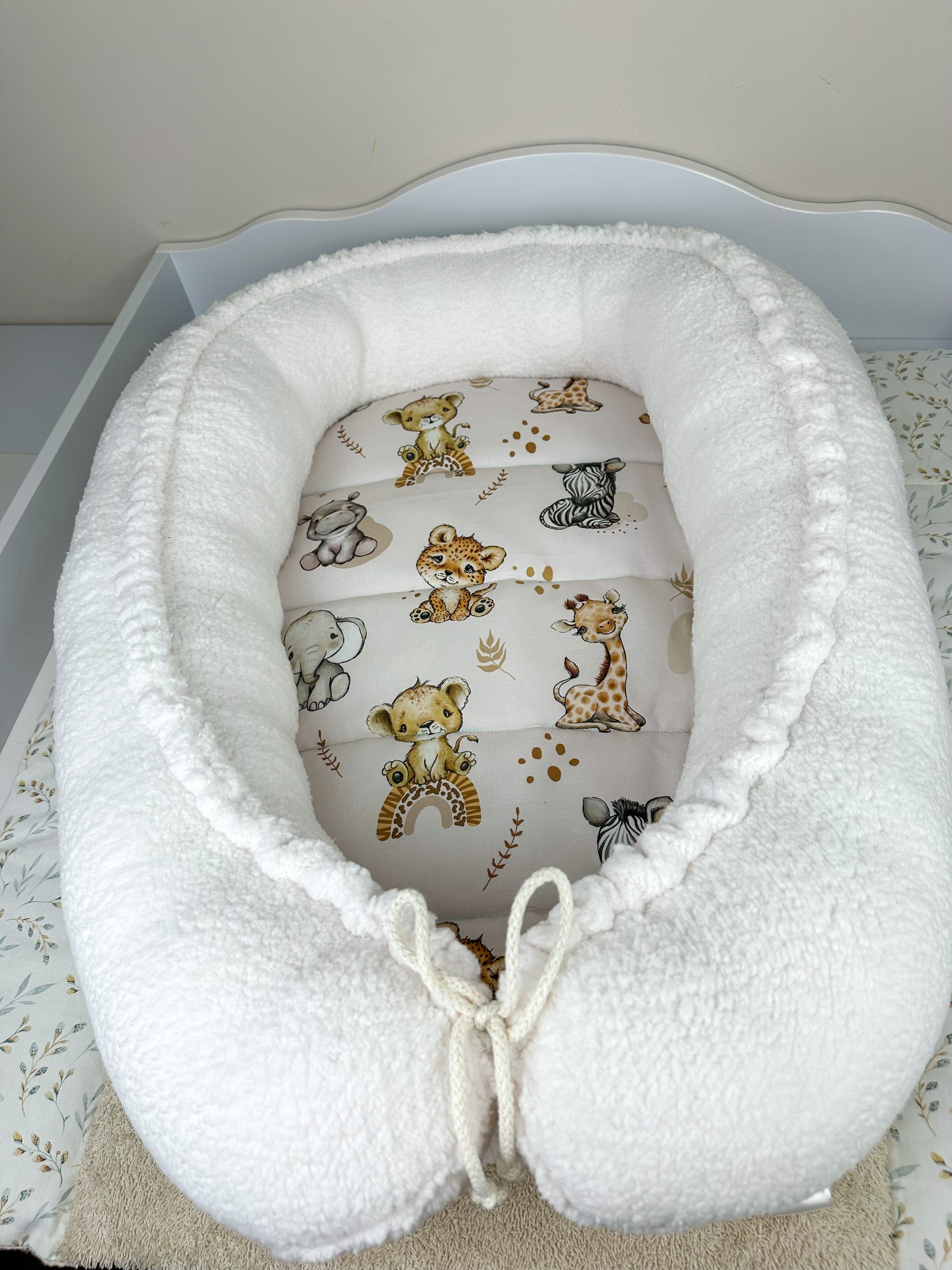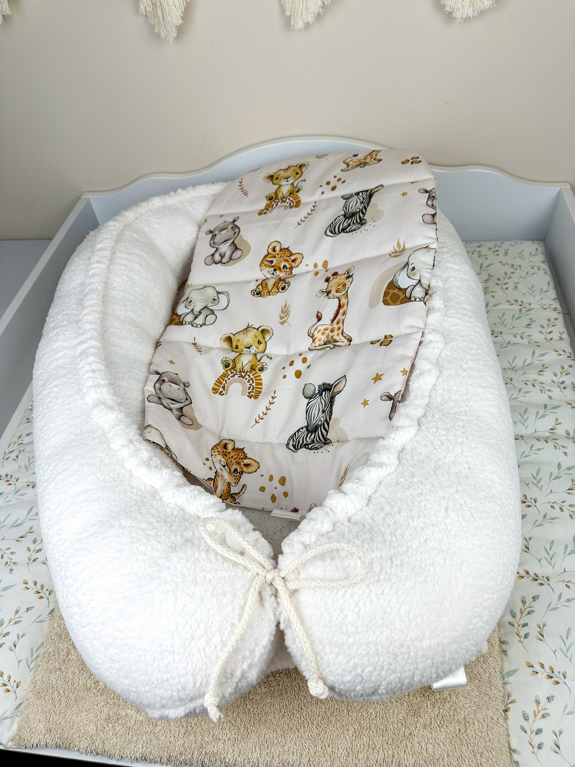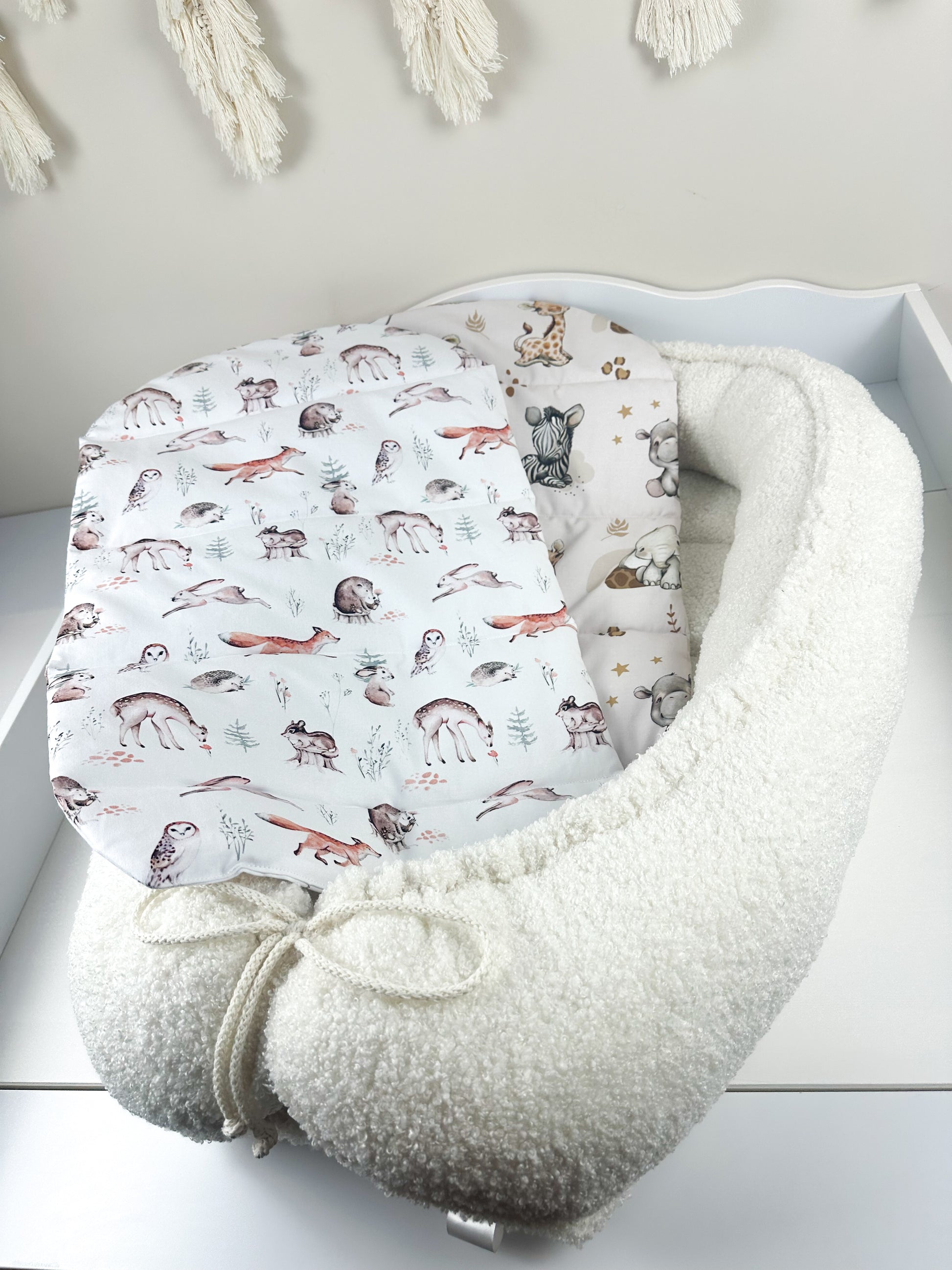 Das Nestchen ist beidseitig verwendbar und sorgt so für Abwechslung. Mit Hilfe des Kordels kann die Größe des Nestchens an die Größe des Babys angepasst werden. Außerdem ist das Nestchen mit einem 4 cm dicken Volumenvlies verstärkt, damit das Baby bequem liegen kann.