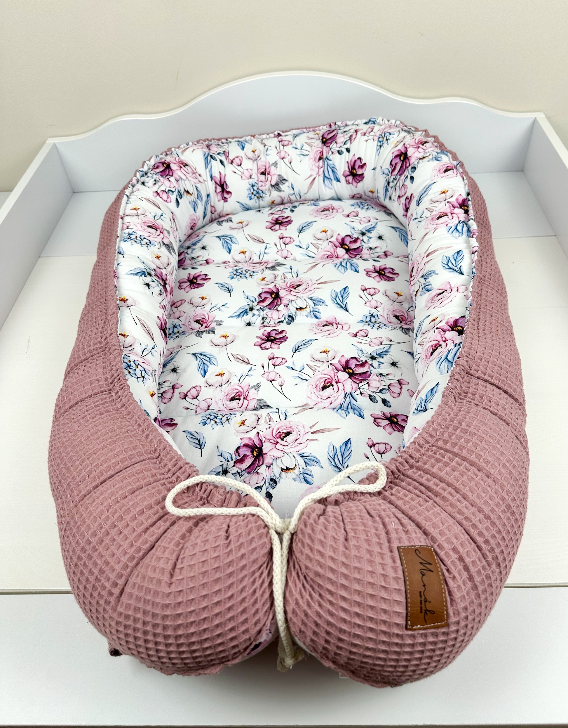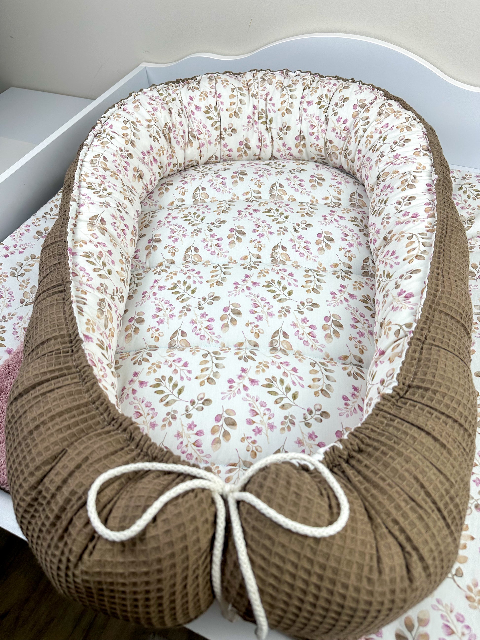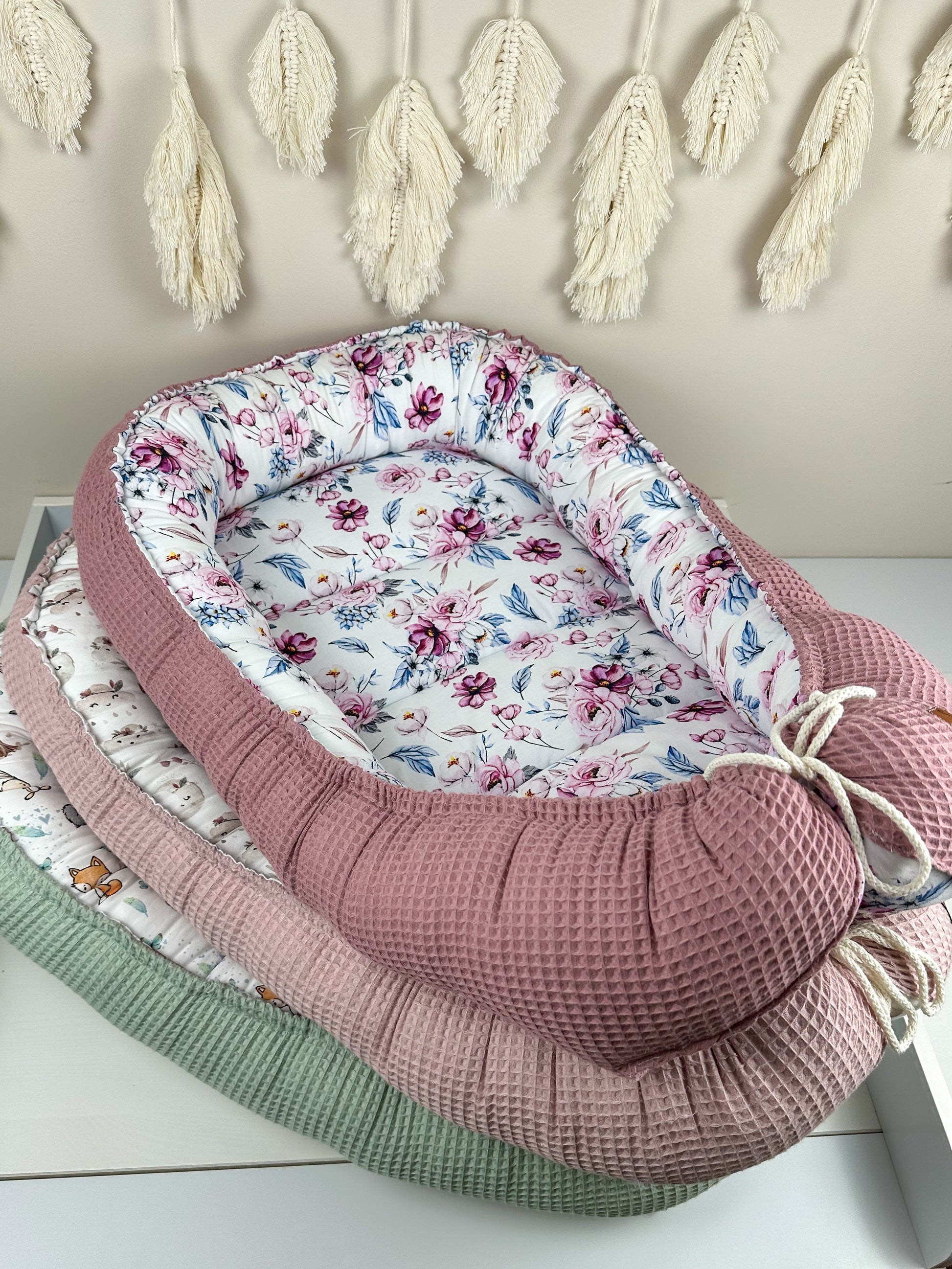 Das Nestchen ist beidseitig verwendbar und sorgt so für Abwechslung. Mit Hilfe des Kordels kann die Größe des Nestchens an die Größe des Babys angepasst werden. Außerdem ist das Nestchen mit einem 4 cm dicken Volumenvlies verstärkt, damit das Baby bequem liegen kann.