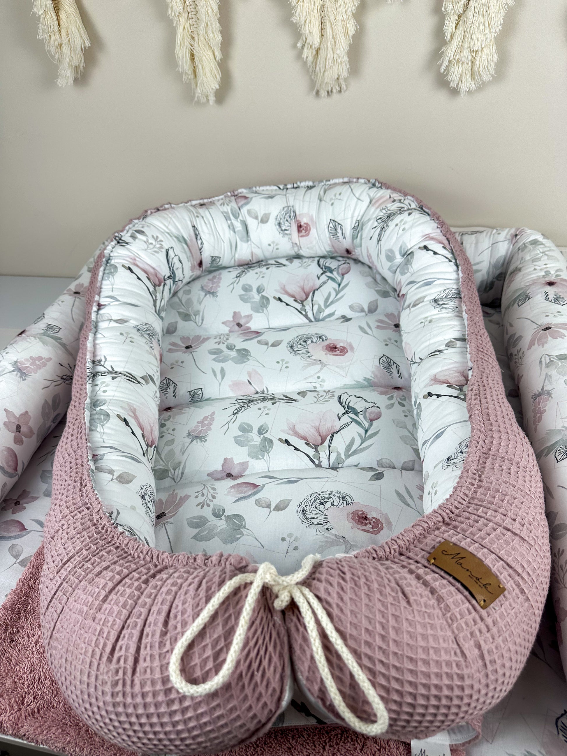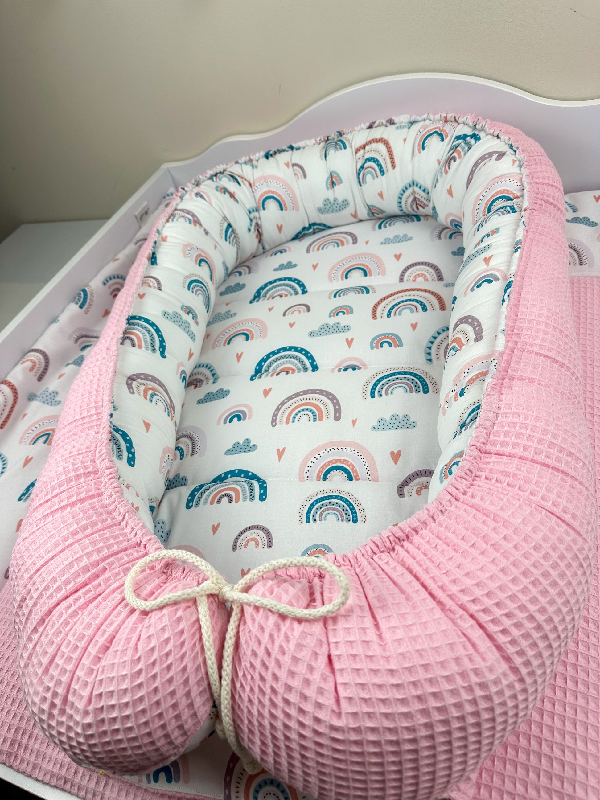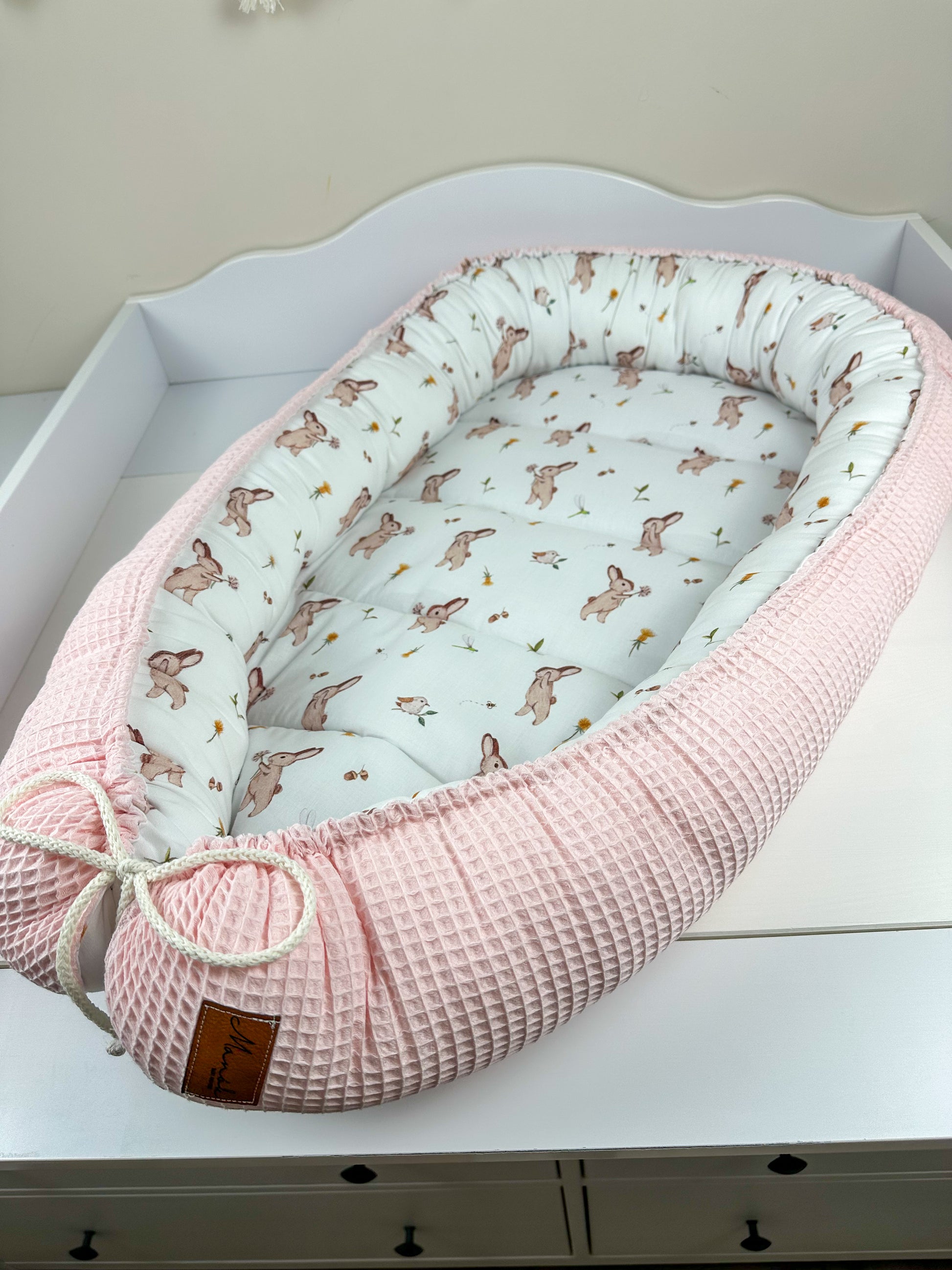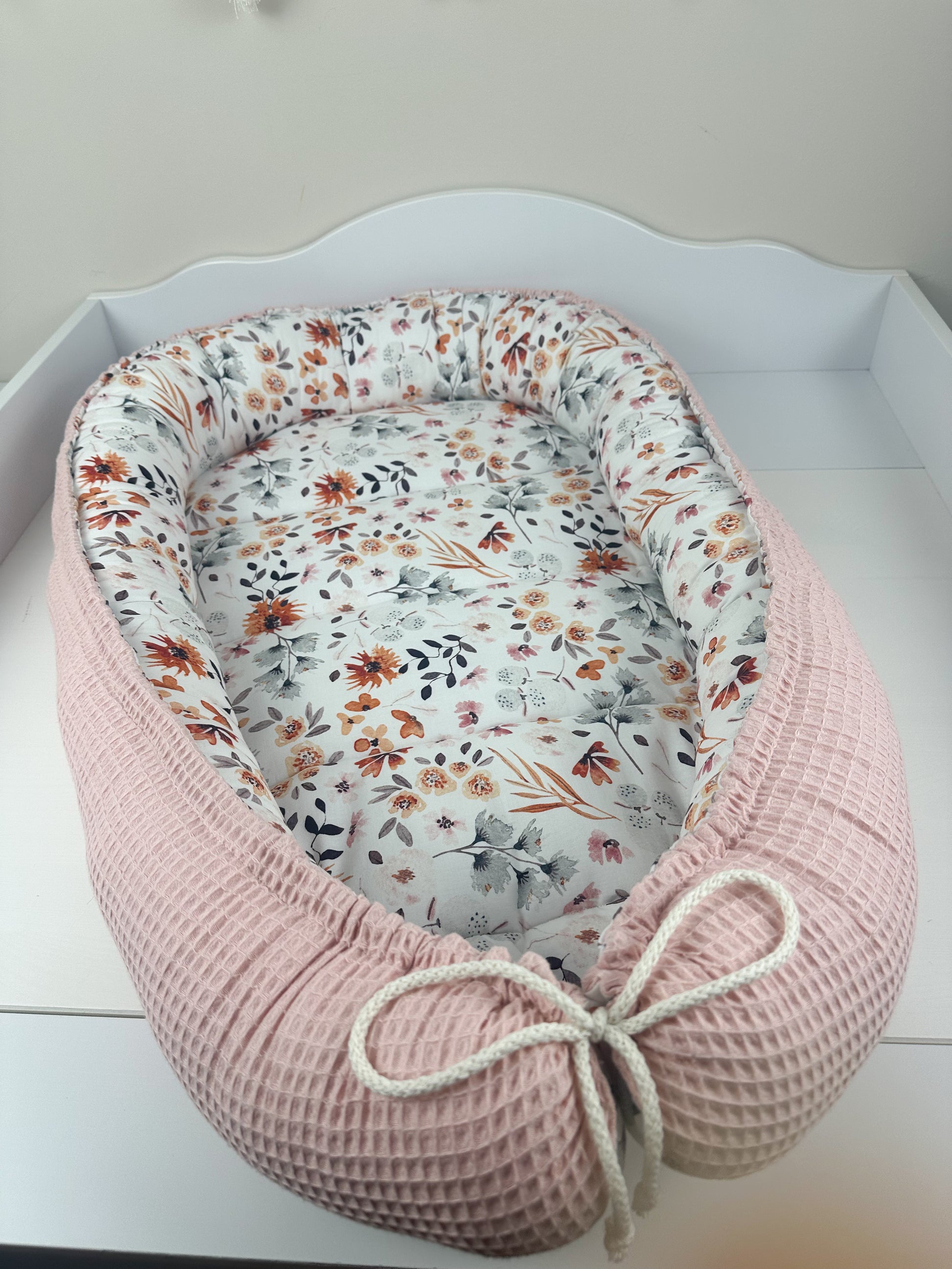 Das Nestchen ist beidseitig verwendbar und sorgt so für Abwechslung. Mit Hilfe des Kordels kann die Größe des Nestchens an die Größe des Babys angepasst werden. Außerdem ist das Nestchen mit einem 4 cm dicken Volumenvlies verstärkt, damit das Baby bequem liegen kann.